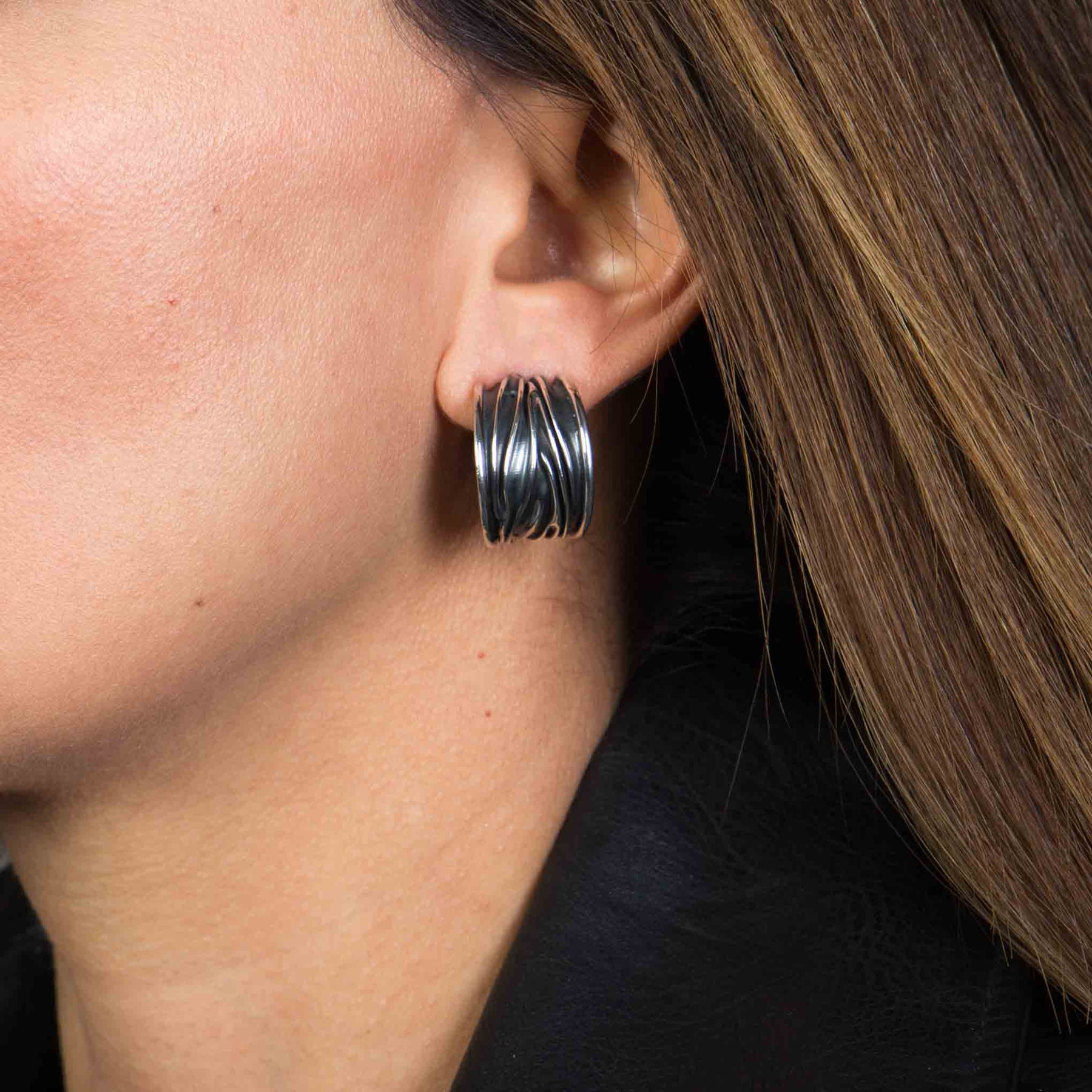 Un par de arracadas solidas con poste hechas en su totalidad de Plata .925 con acabado pavonado y tamaño mediano que las hace lucir originales e imponentes ante cualquier mirada, son el accesorio ideal para cualquier ocasión.