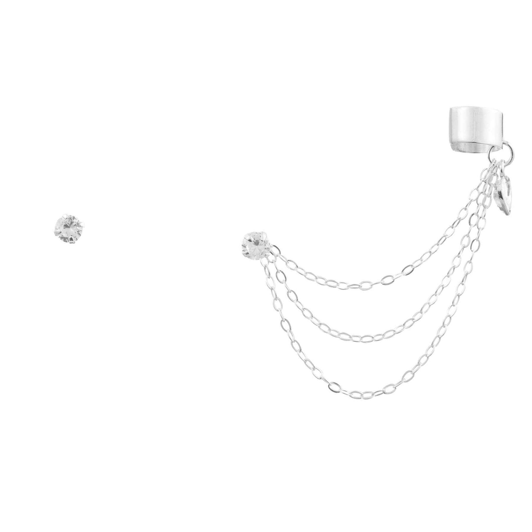 Aretes de plata .925 con zirconia blanca, estos vienen acompañados de un clip de plata que quedará ajustado en el cartílago de tu oreja, dando la ilusión de ser otro arete; de este mismo cuelgan tres ligeras cadenas (adornadas con una pluma o un corazón), las cuales van agarradas del poste del arete con zirconia, estas cadenas se pueden remover de este mismo, por lo tanto, se pueden usar por separado.