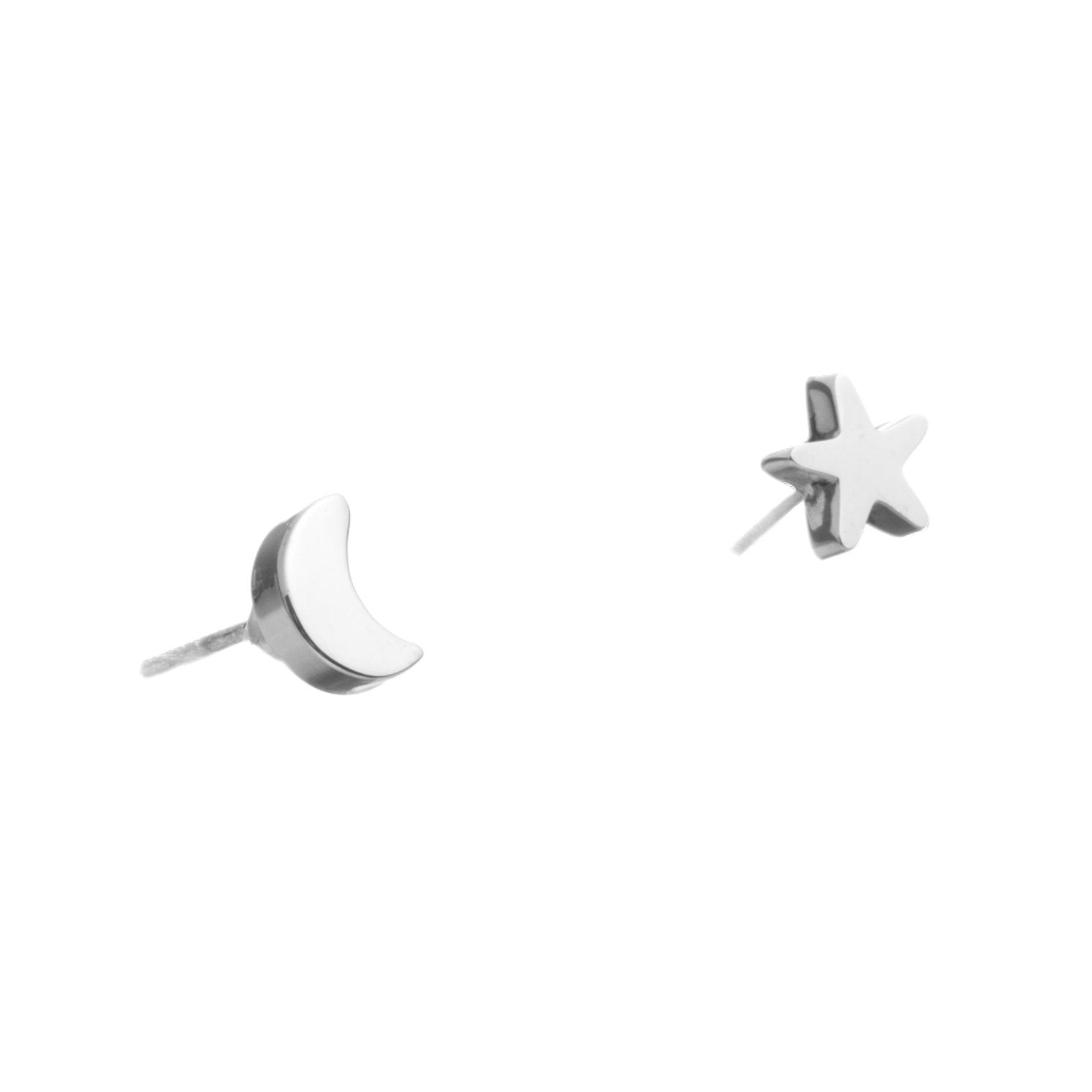 Un par de aretes aparentemente "disparejo" a la vista, y no es así, ya que se compone por una luna y una estrella de Plata de 9.25, que al igual que las reales con el impacto de la luz brillaran de forma única, es el complemento ideal de esas noches de gala junto a tus prendas de colores azules, aunque queda perfecto para cualquier momento del día.