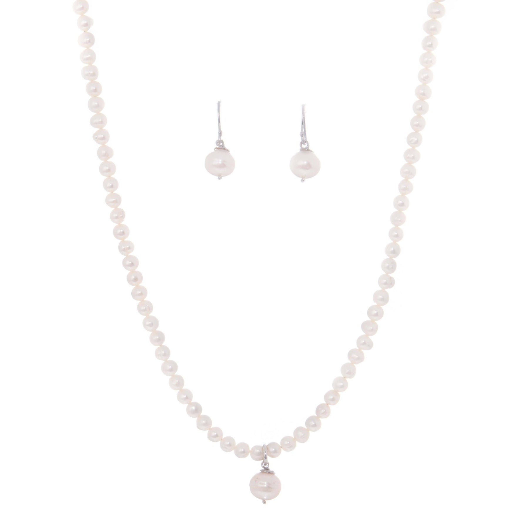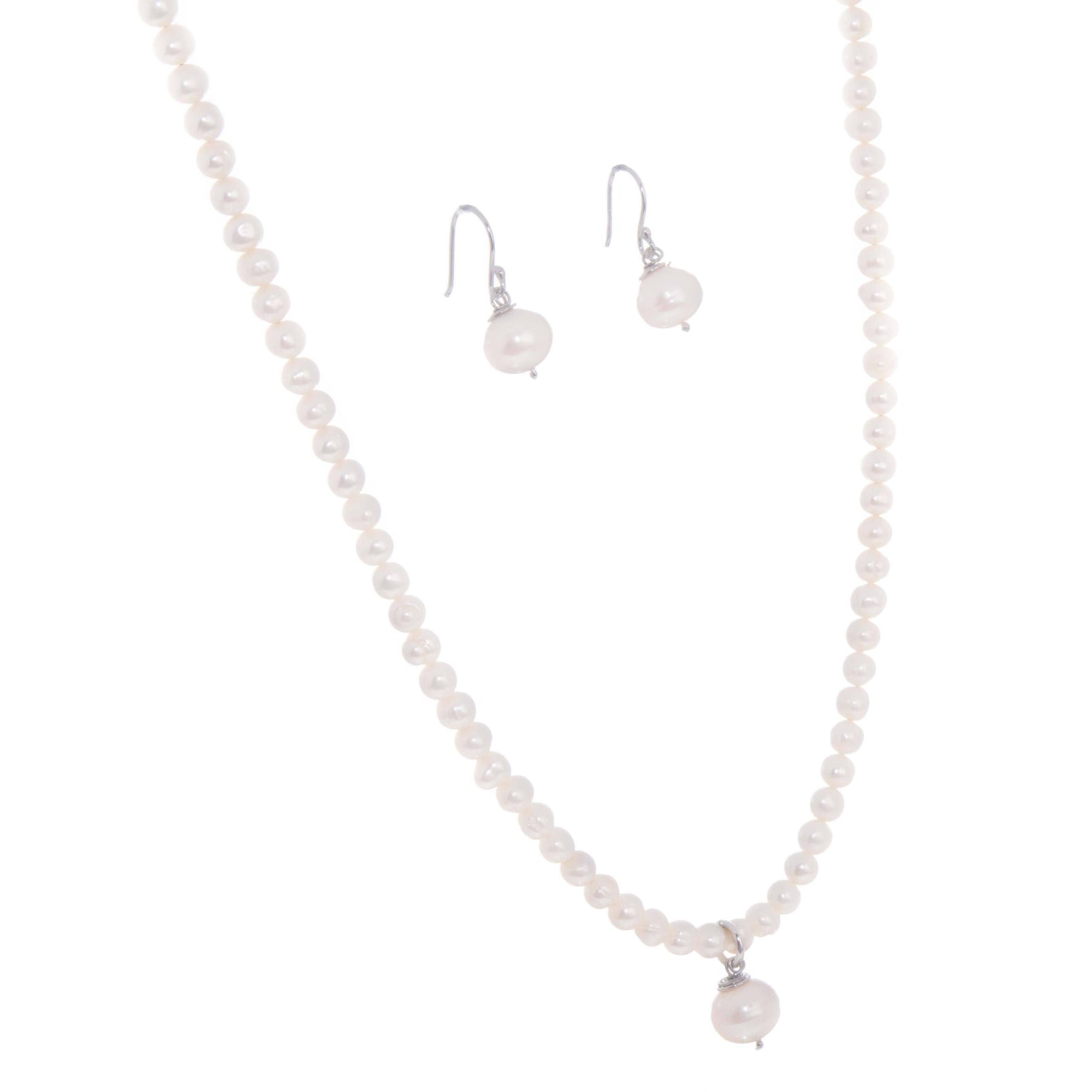 Fresca y radiante te hará sentir este collar de perlas de río con detalles en Plata ley .925, los aretes que incluye el collar también son perlas cultivadas para hacer una unión perfecta y en armonía contigo.