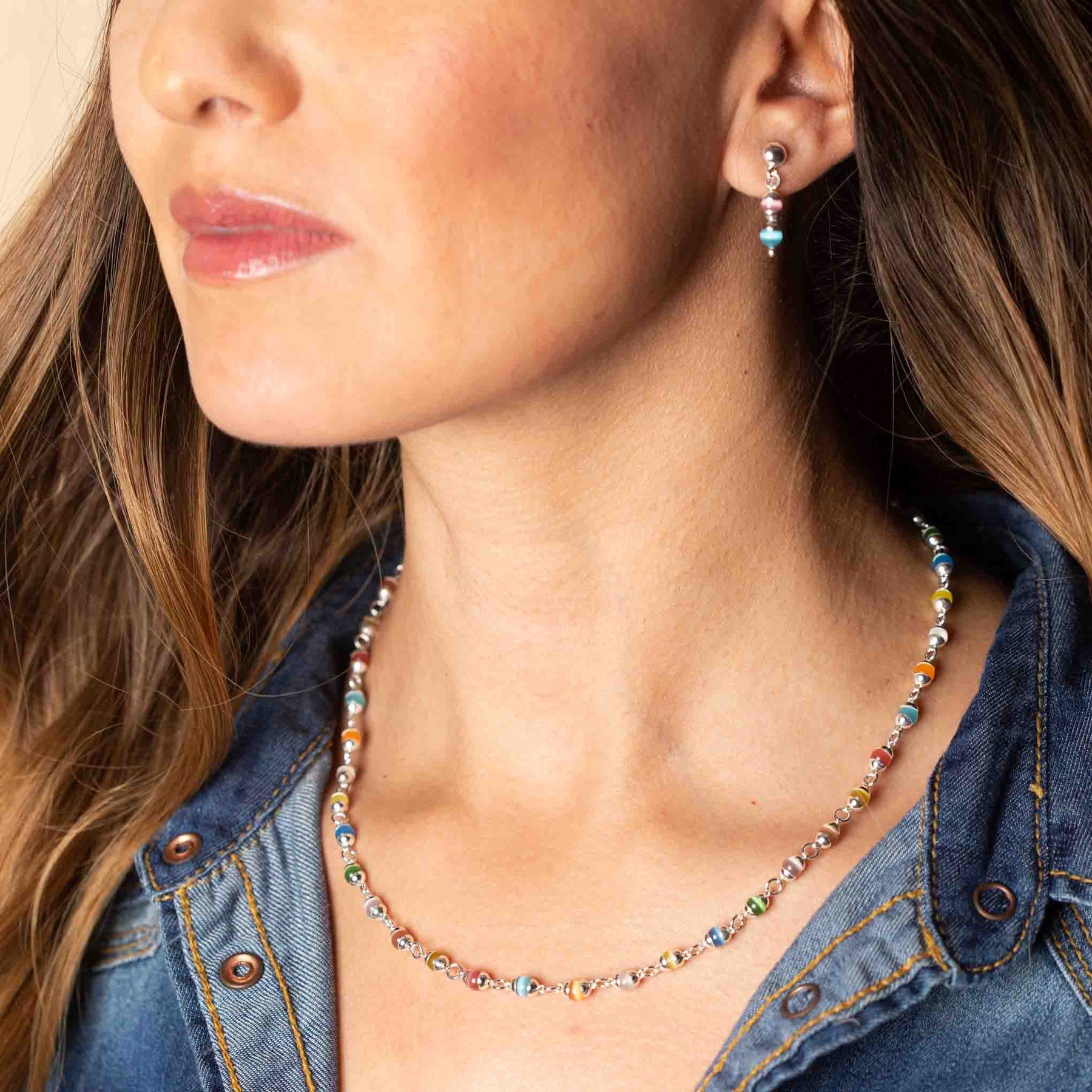 Collar de plata con piedras mini ojo de gato multicolor
