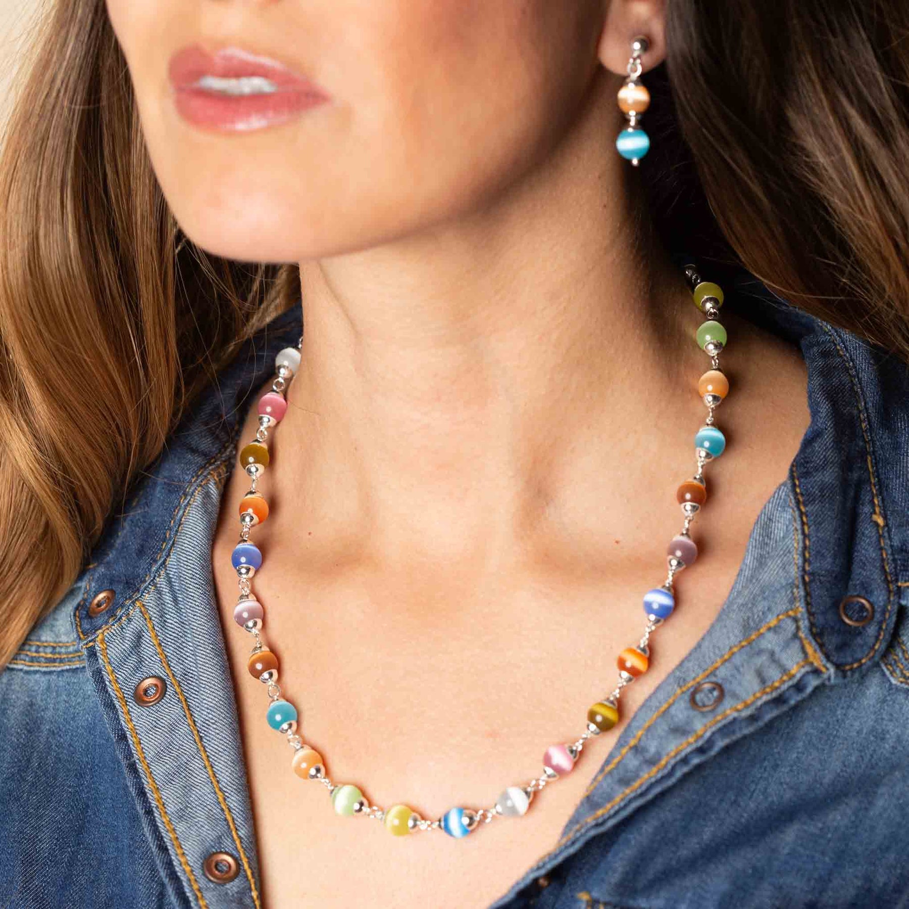 Un precioso collar donde convive Plata .925 y piedras ojo de gato, su diseño se compone por pequeños casquillos de plata que sostienen las coloridas piedras nacaradas de tono pastel multicolor, complementado por un par de aretes, es ideal para usar en esta temporada de primavera - verano.