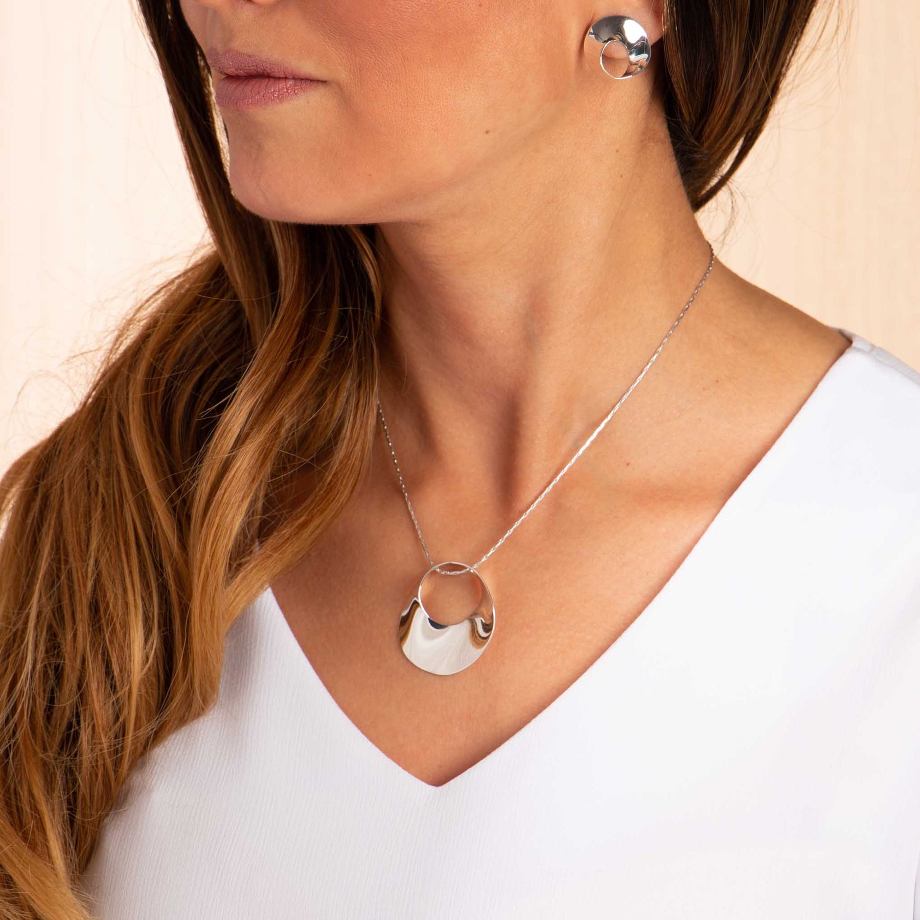 Juego Dona Irregular de Plata ley .925, cuando estás lejos de esos días de paz, utilizas el dije y los aretes de plata con una forma que te recuerda los movimientos ondulantes del agua y de la tela. Tus accesorios, muchas veces, se vuelven la evocación de los días tranquilos frente a la playa. Para realizar los aretes, se esmeraron en crear esta misma onda en un diseño discreto pegado a la oreja.