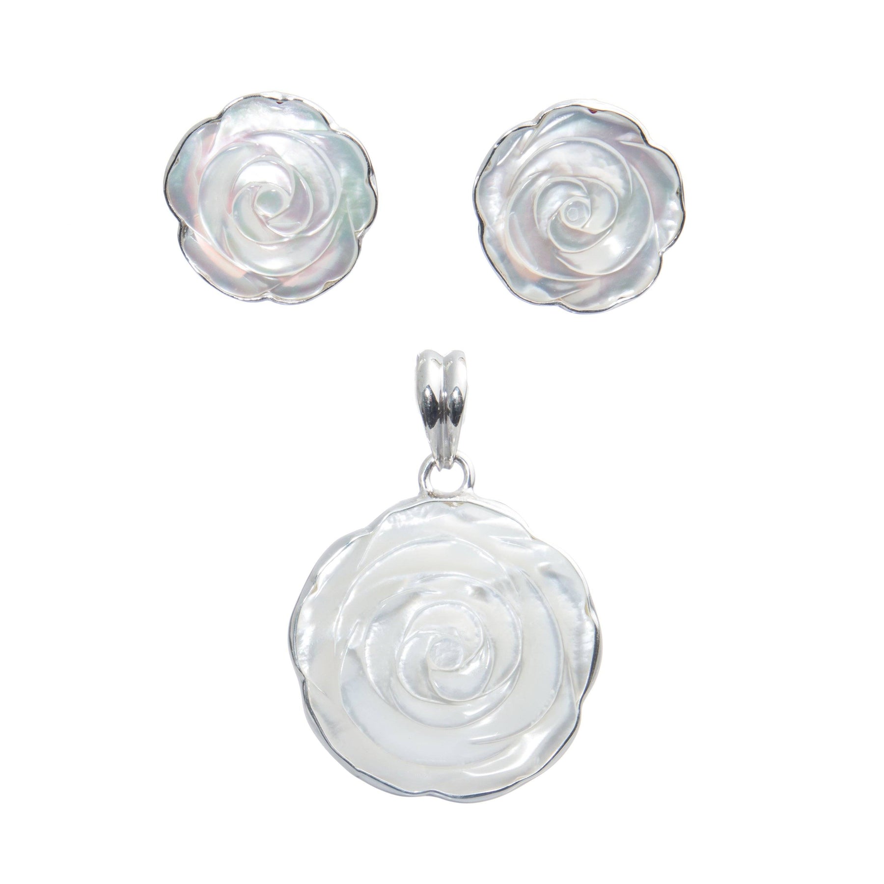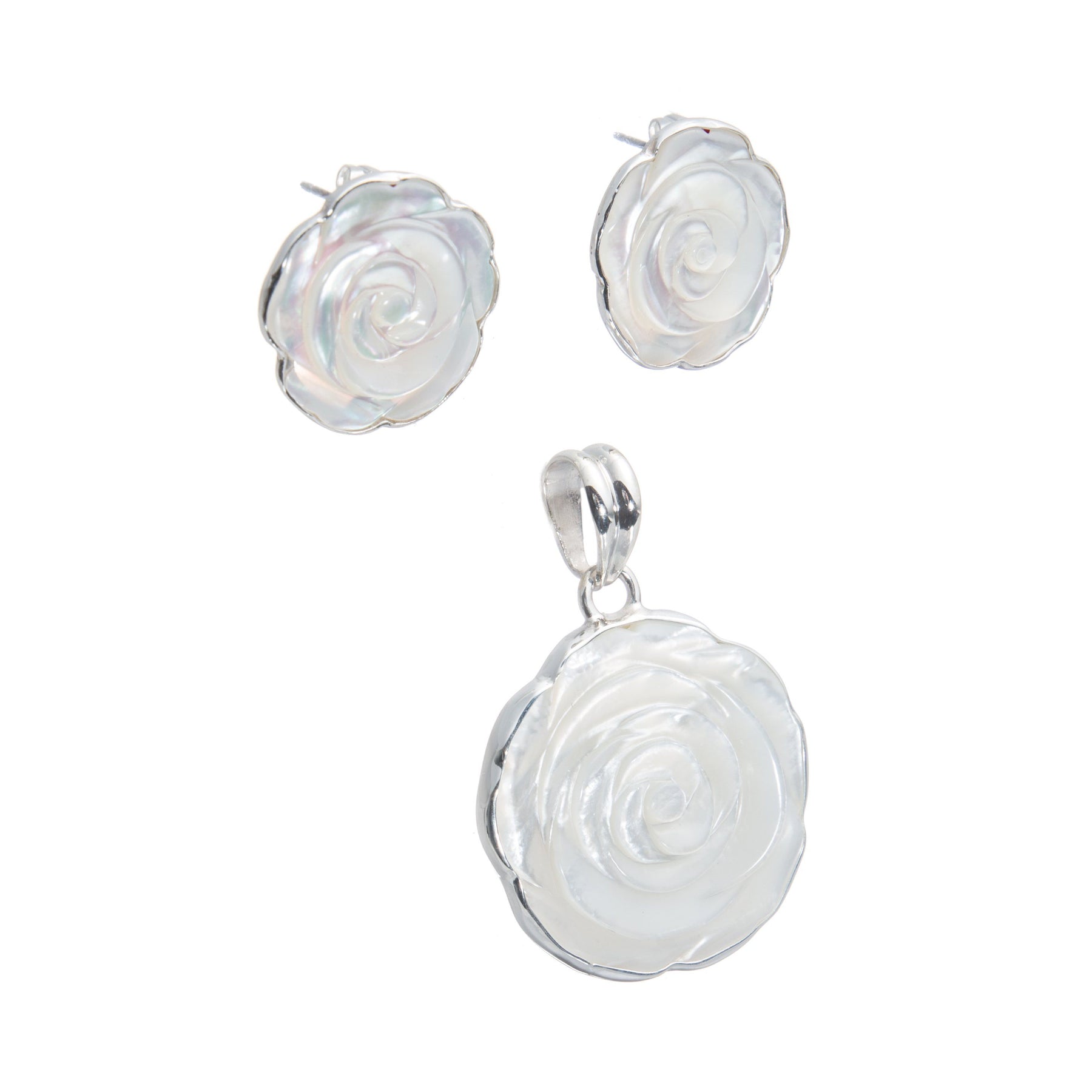 Aretes y dije que incorpora en su diseño el concepto de naturaleza a través de flores blancas nacaradas labradas en madre perla con un biselado de Plata. 925. Ideal para toda clase de eventos formales. Completa el juego de madre perla por su pulsera y su anillo