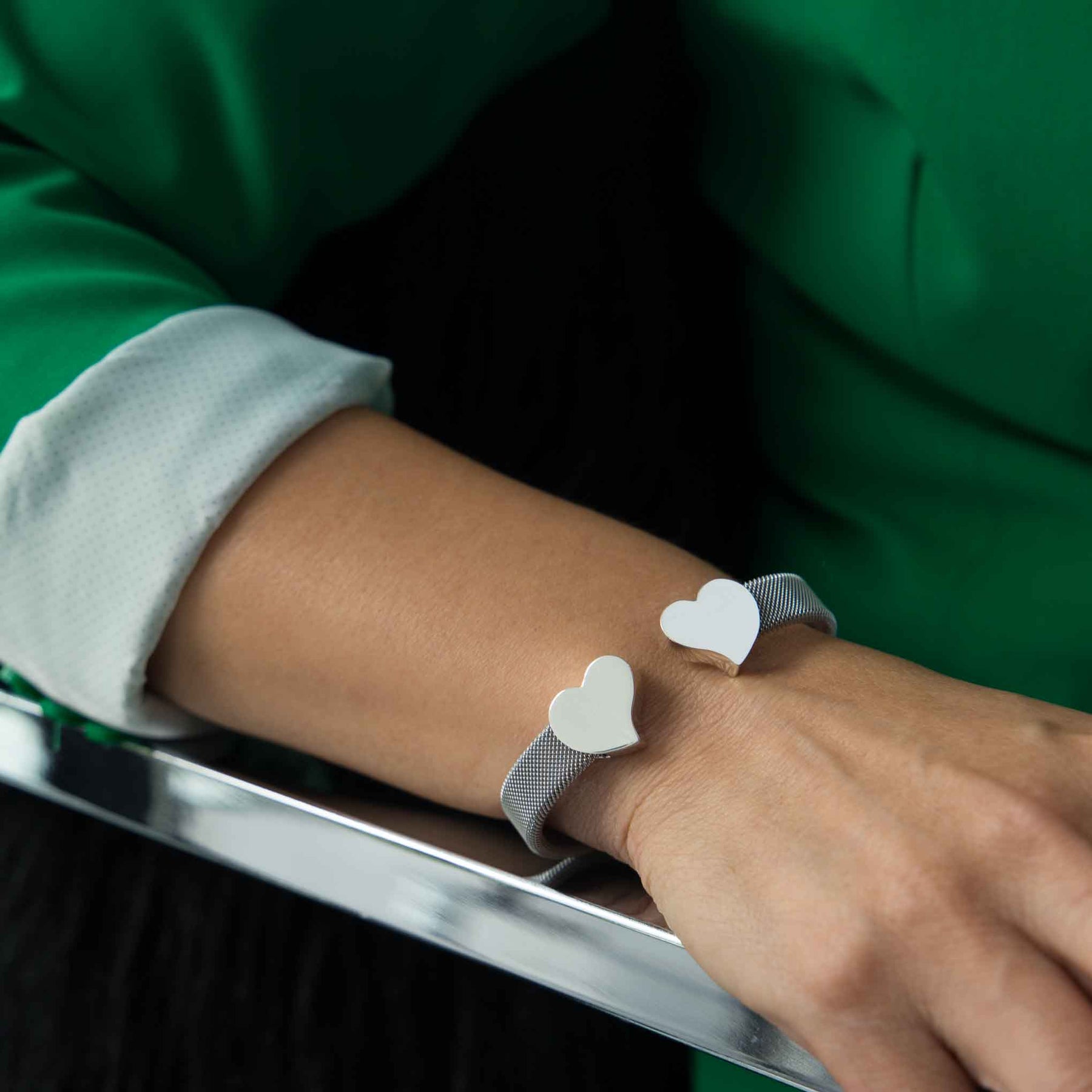 Una combinación hermosa conforma este brazalete en donde los corazones están hechos de Plata .925 los cuales están sujetados y conectados gracias al brazalete mismo que está hecho en acero inoxidable, gracias a sus materiales podrás observar magníficos destellos al contacto con la luz, es el accesorio indicado para ocasiones formales con tu vestido más elegante.