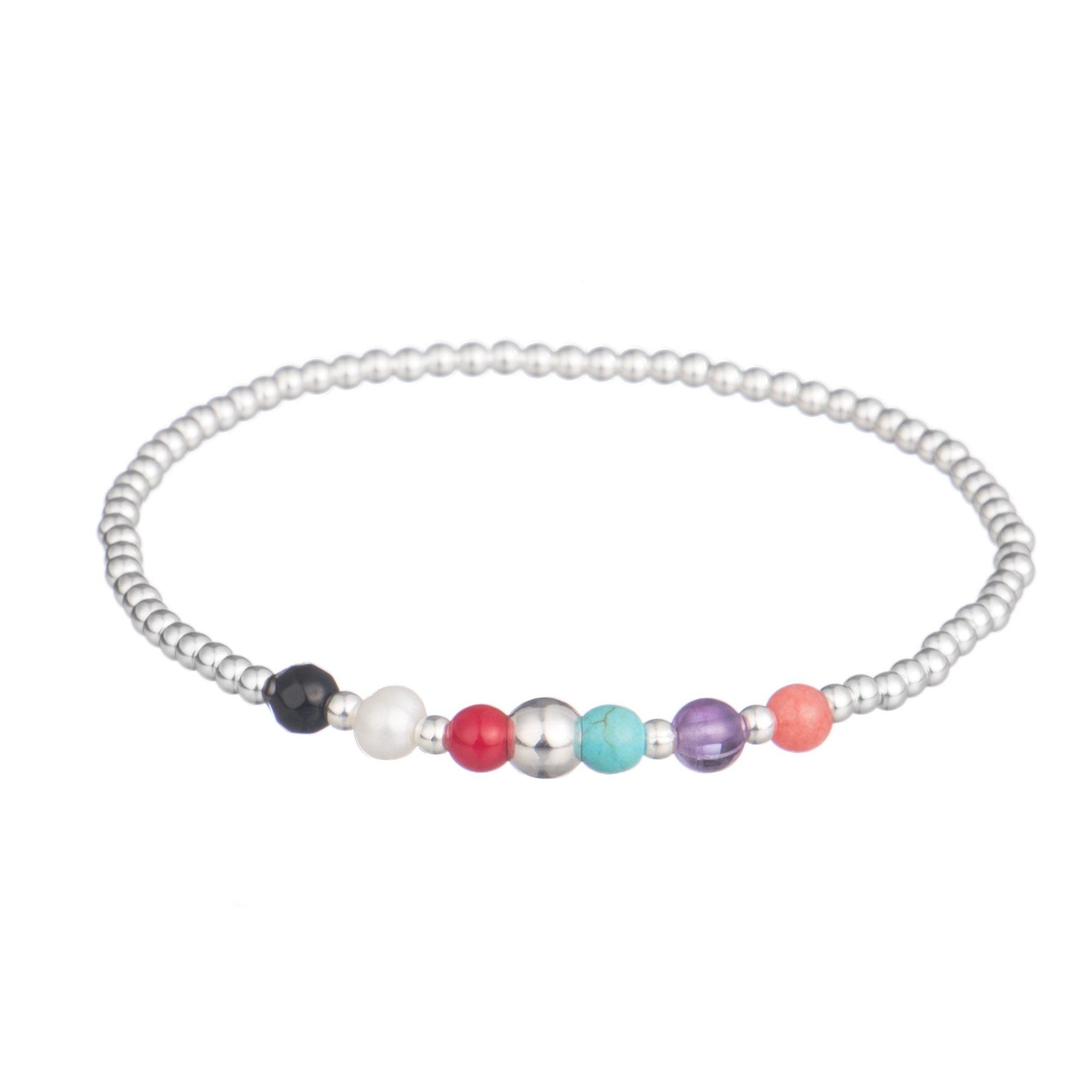 Pulsera elástica conformada por seis piedras distintas de las cuales en el centro resalta una bolita de plata, ligera y cómoda para usar en cualquier ocasión
