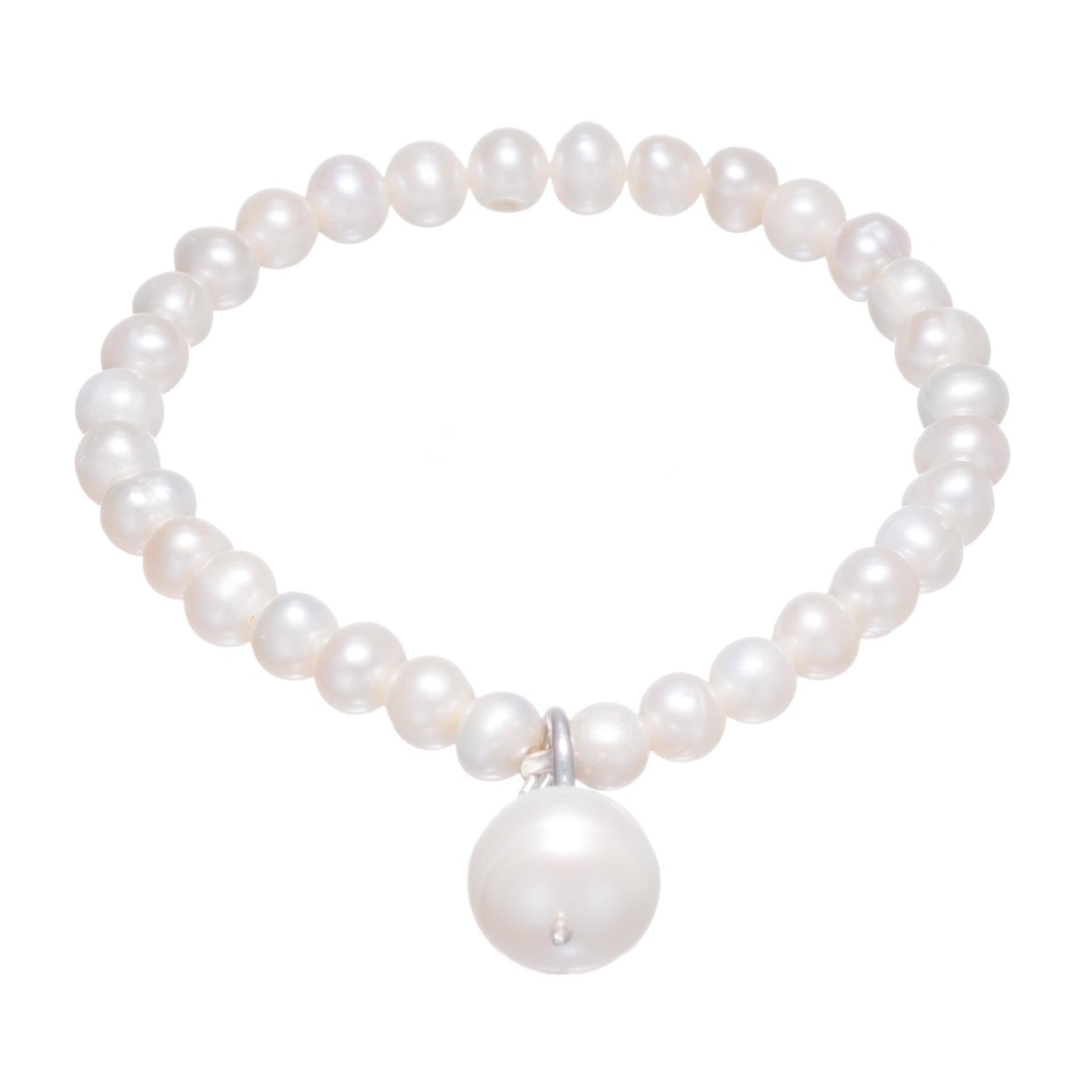 Una hermosa pulsera constituida en su totalidad por perlas cultivadas en río, todas del mismo tamaño por excepción de una que sobresale y que está sujetada por un colgante hecho de Plata .925, es un accesorio que puedes usar en tu día a día con todo tipo de prendas.