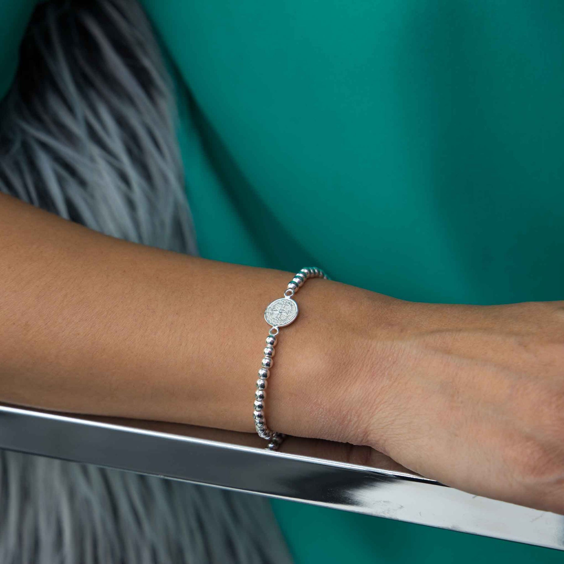 Brillante, cómoda y ajustable es lo que describe a la perfección esta pulsera de San Benito que está confeccionada en su totalidad de Plata Ley .925, su diseño está compuesto en su mayoría por pequeñas esferas de plata que bien son perfectamente combinables con cualquier estilo de prenda que vistas. Descubre nuestra increíbles pulseras de San Benito, ademas de nuestras medalla chica y mediana