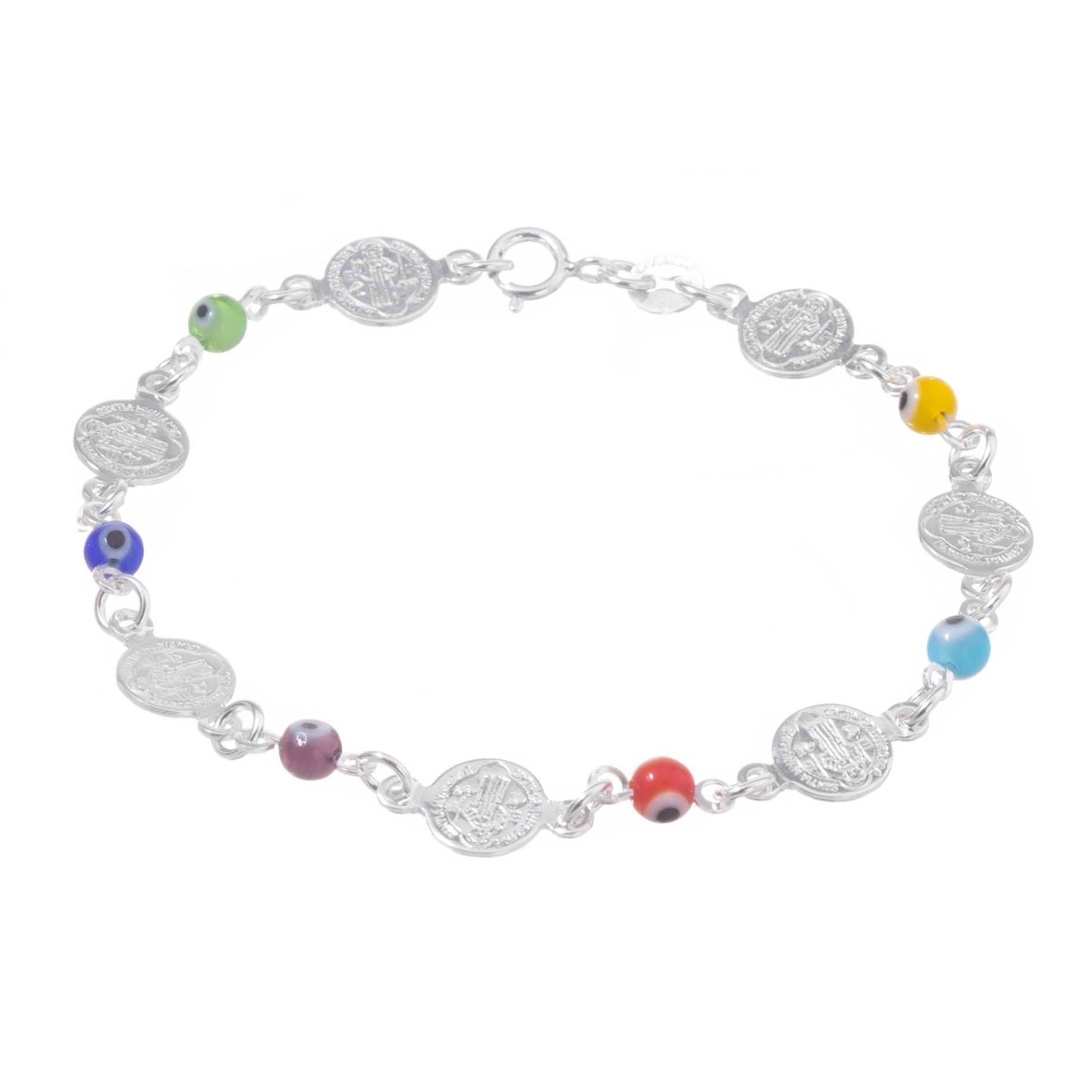 Encantadora pulsera diseñada en plata .925 compuesta por 7 medallas de San Benito intercaladas por "ojitos de la buena suerte" en diferentes colores, esta pieza tiene un alto valor simbólico de protección y va perfecto para cualquier outfit en que decidas usarla, no te arrepentirás de tenerla.