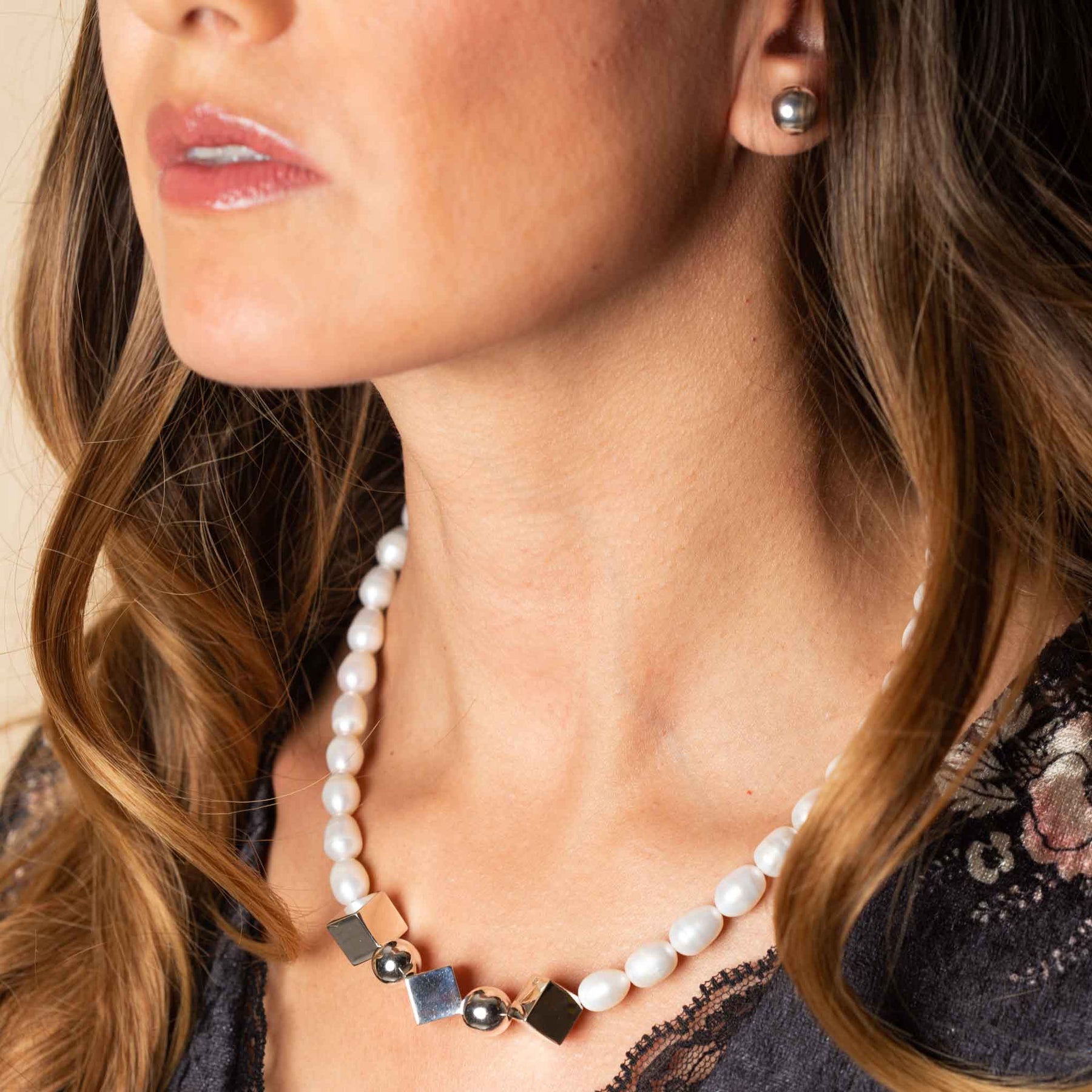 Collar de Perlas y Plata ley .925 Cubo. Si eres mujer que se distingue por vestir perlas no puedes llevar las mismas en eventos que consideras distinguidos, encontramos una combinación que logra alzar la caracterización de estas bellezas. Collar corto de perlas intercaladas con cubos y esferas de plata al frente.